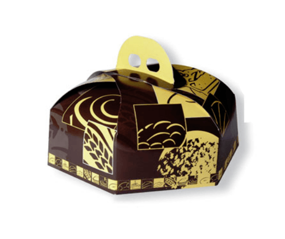 CAJA PARA TARTAS, de cartón con forma hexagonal, decorada con espigas.