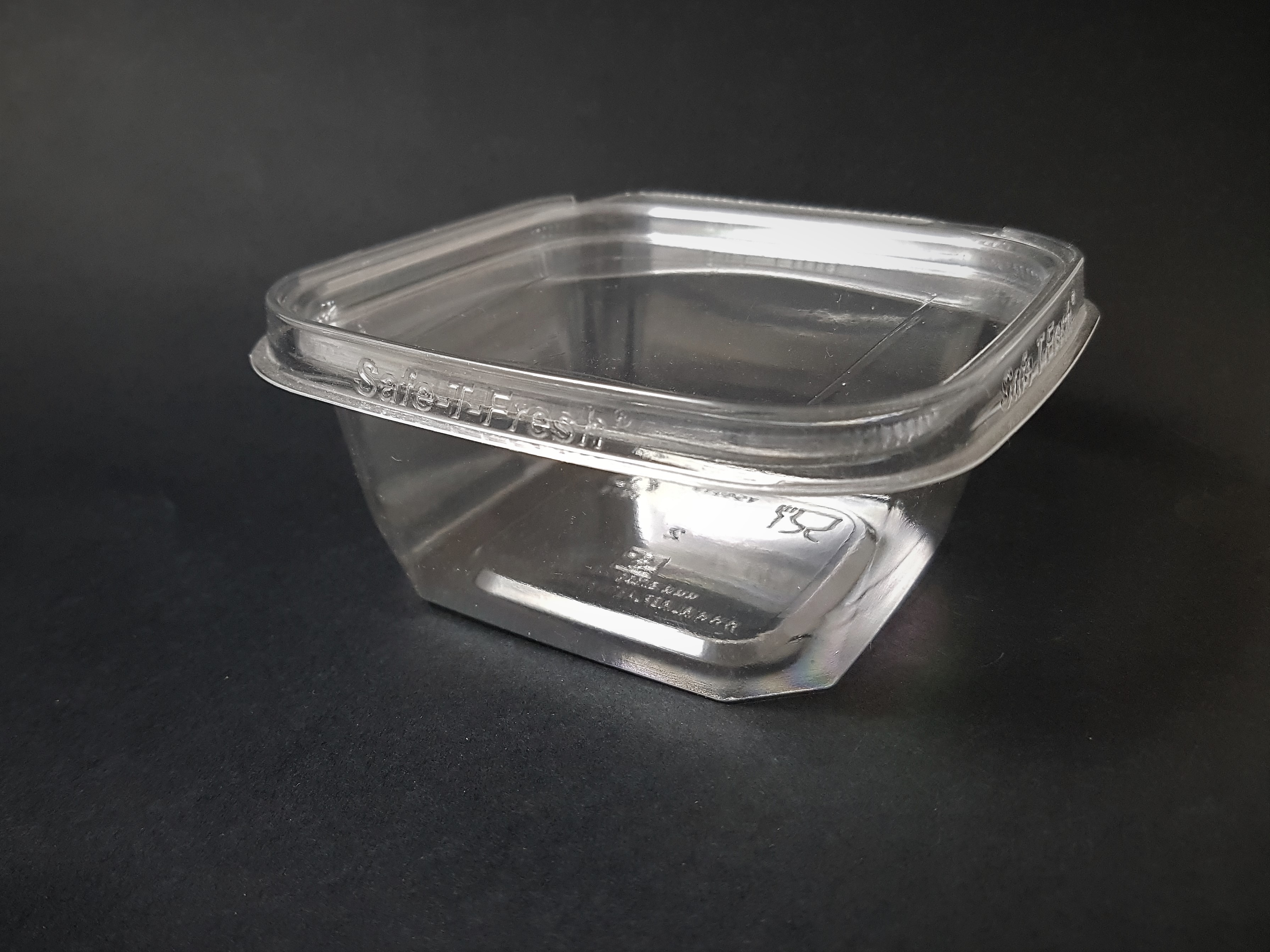 TARRINAS SAFE-T-FRESH CON TAPA TRANSPARENTE PARA USO ALIMENTARIO CON 350 ml DE CAPACIDAD CON CIERRE SAFE T-GARD , que impiden la manipulación del producto sin necesidad de una banda retractil y muy resistente al goteo. Este envase tiene un brillo superior y una gran claridad donde resalta el producto y no el envase.